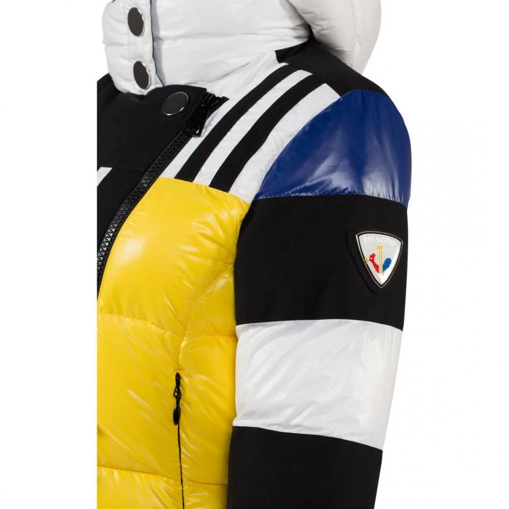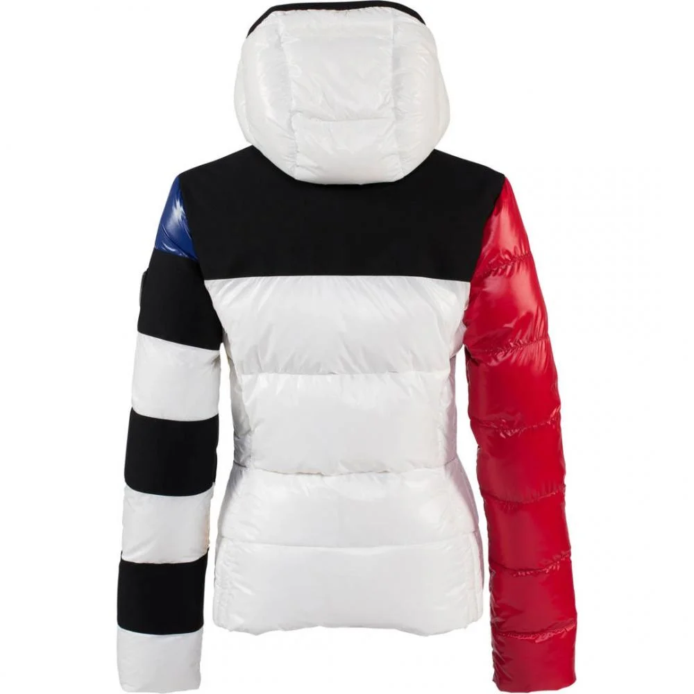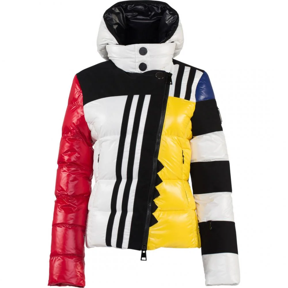 Женская лыжная куртка HOPI DOWN - это пуховик с модной офсетной молнией, цветными вставками ярких цветов и глянцевой тканью.